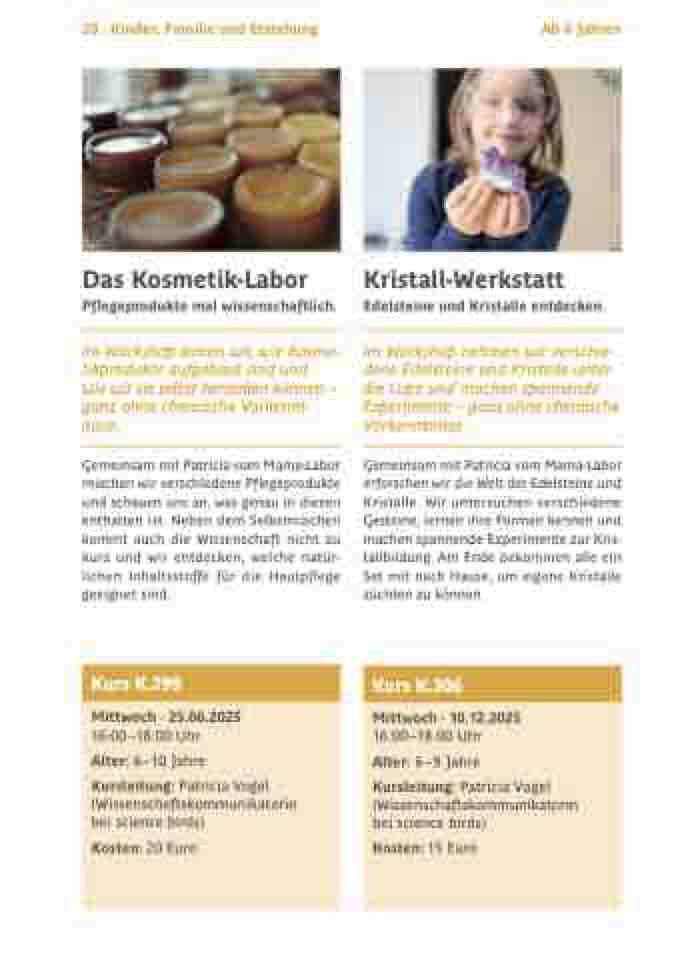 Gemeinsam mit Patricia vom Mama-Labor erforschen wir die Welt der Edelsteine und Kristalle. Wir untersuchen verschiedene Gesteine, lernen ihre Formen kennen und machen spannende Experimente zur Kris- tallbildung. Am Ende bekommen alle ein Set mit nach Hause, um eigene Kristalle züchten zu können.