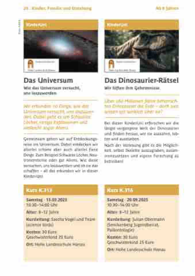 Gemeinsam gehen wir auf Entdeckungs- reise ins Universum. Dabei entdecken wir allerlei schöne aber auch allerlei fiese Dinge. Zum Beispiel Schwarze Löcher, Neu- tronensterne oder gar Aliens. Wie diese versuchen, uns loszuwerden und ob sie das schaffen – all das erkunden wir in dieser Kinder-Uni.