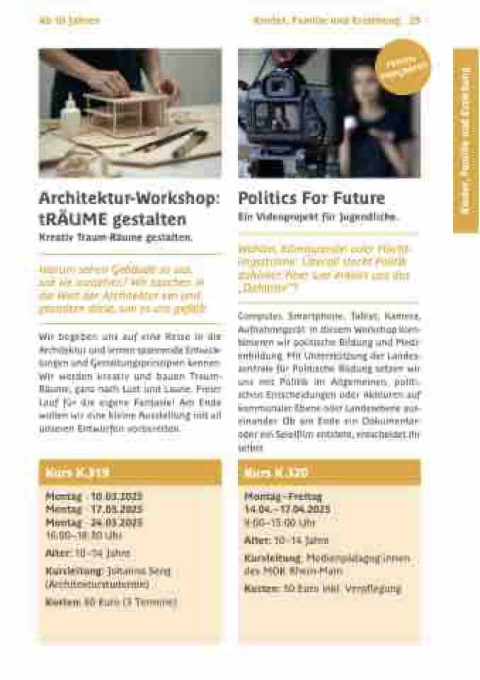 Wir begeben uns auf eine Reise in die Architektur und lernen spannende Entwick- lungen und Gestaltungsprinzipien kennen. Wir werden kreativ und bauen Traum- Räume, ganz nach Lust und Laune. Freier Lauf für die eigene Fantasie! Am Ende wollen wir eine kleine Ausstellung mit all unseren Entwürfen vorbereiten.
