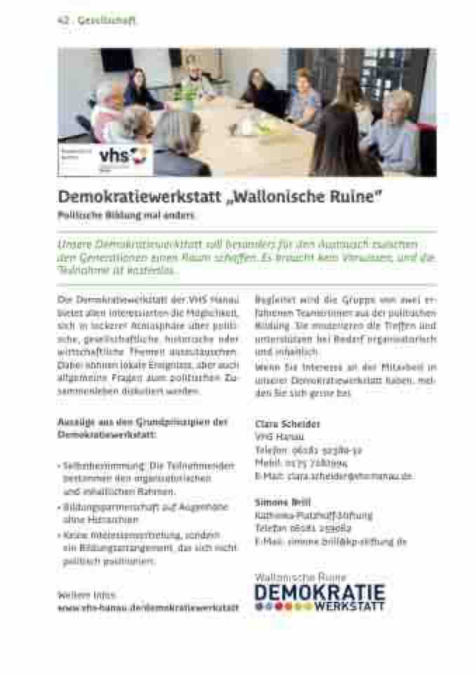 Die Demokratiewerkstatt der VHS Hanau bietet allen Interessierten die Möglichkeit, sich in lockerer Atmosphäre über politi- sche, gesellschaftliche, historische oder wirtschaftliche Themen auszutauschen. Dabei können lokale Ereignisse, aber auch allgemeine Fragen zum politischen Zu- sammenleben diskutiert werden.