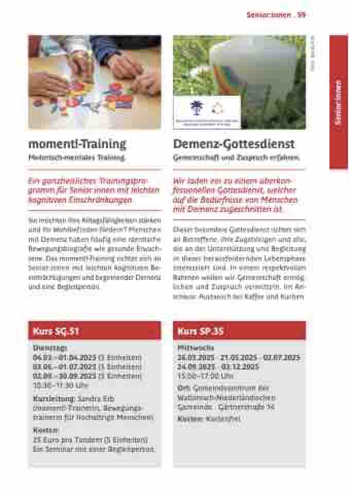 Sie möchten Ihre Alltagsfähigkeiten stärken und Ihr Wohlbefinden fördern? Menschen mit Demenz haben häufig eine identische Bewegungsbiografie wie gesunde Erwach- sene. Das moment!-Training richtet sich an Senior:innen mit leichten kognitiven Be- einträchtigungen und beginnender Demenz und eine Begleitperson.