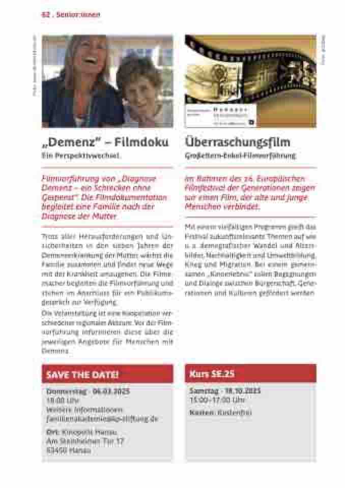 Die Veranstaltung ist eine Kooperation ver- schiedener regionaler Akteure. Vor der Film- vorführung informieren diese über die jeweiligen Angebote für Menschen mit Demenz.