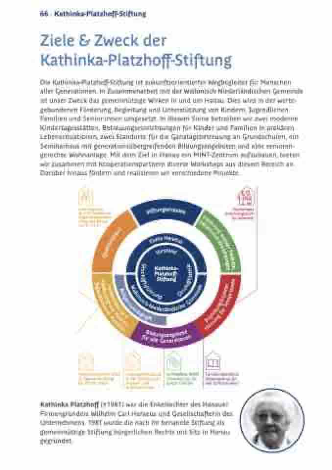 Die Kathinka-Platzhoff-Stiftung ist zukunftsorientierter Wegbegleiter für Menschen aller Generationen. In Zusammenarbeit mit der Wallonisch-Niederländischen Gemeinde ist unser Zweck das gemeinnützige Wirken in und um Hanau. Dies wird in der werte- gebundenen Förderung, Begleitung und Unterstützung von Kindern, Jugendlichen, Familien und Senior:innen umgesetzt. In diesem Sinne betreiben wir zwei moderne Kindertagesstätten, Betreuungseinrichtungen für Kinder und Familien in prekären Lebenssituationen, zwei Standorte für die Ganztagsbetreuung an Grundschulen, ein Seminarhaus mit generationsübergreifenden Bildungsangeboten und eine senioren- gerechte Wohnanlage. Mit dem Ziel in Hanau ein MINT-Zentrum aufzubauen, bieten wir zusammen mit Kooperationspartnern diverse Workshops aus diesem Bereich an. Darüber hinaus fördern und realisieren wir verschiedene Projekte.