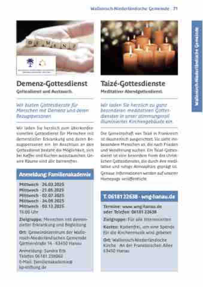 Die Gemeinschaft von Taizé in Frankreich ist ökumenisch ausgerichtet. Sie zieht ins- besondere Menschen an, die nach Frieden und Versöhnung suchen. Ein Taizé-Gottes- dienst ist eine besondere Form des christ- lichen Gottesdienstes, die durch ihre medi- tative und ruhige Atmosphäre geprägt ist. Genaue Informationen werden auf unserer Homepage veröffentlicht.