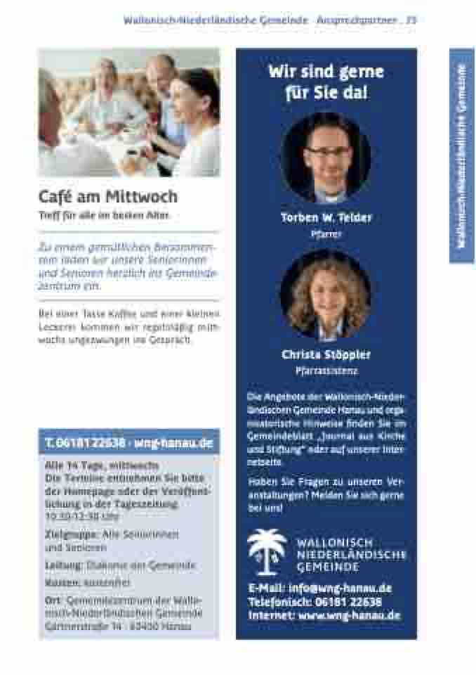 Die Angebote der Wallonisch-Nieder- ländischen Gemeinde Hanau und orga- nisatorische Hinweise finden Sie im Gemeindeblatt „Journal aus Kirche und Stiftung“ oder auf unserer Inter- netseite.