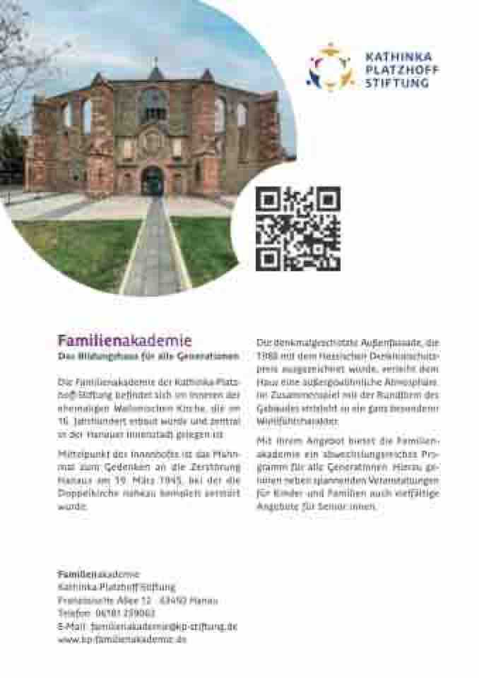 Die Familienakademie der Kathinka-Platz- hoff-Stiftung befindet sich im Inneren der ehemaligen Wallonischen Kirche, die im 16. Jahrhundert erbaut wurde und zentral in der Hanauer Innenstadt gelegen ist.