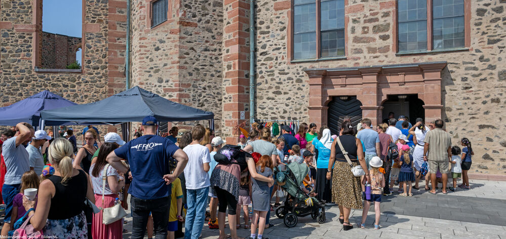 Wir nutzen für die „Betriebe“ die Räumlichkeiten in der Ruine, mehrere Zelte auf dem Platz um die Wallonische Ruine und Pavillons. Sonnenschirme und -segel sowie einige kleine Bäume auf den Wiesen sorgen auch für Schatten. Zwischendurch halten sich die Kinder immer wieder draußen auf.
